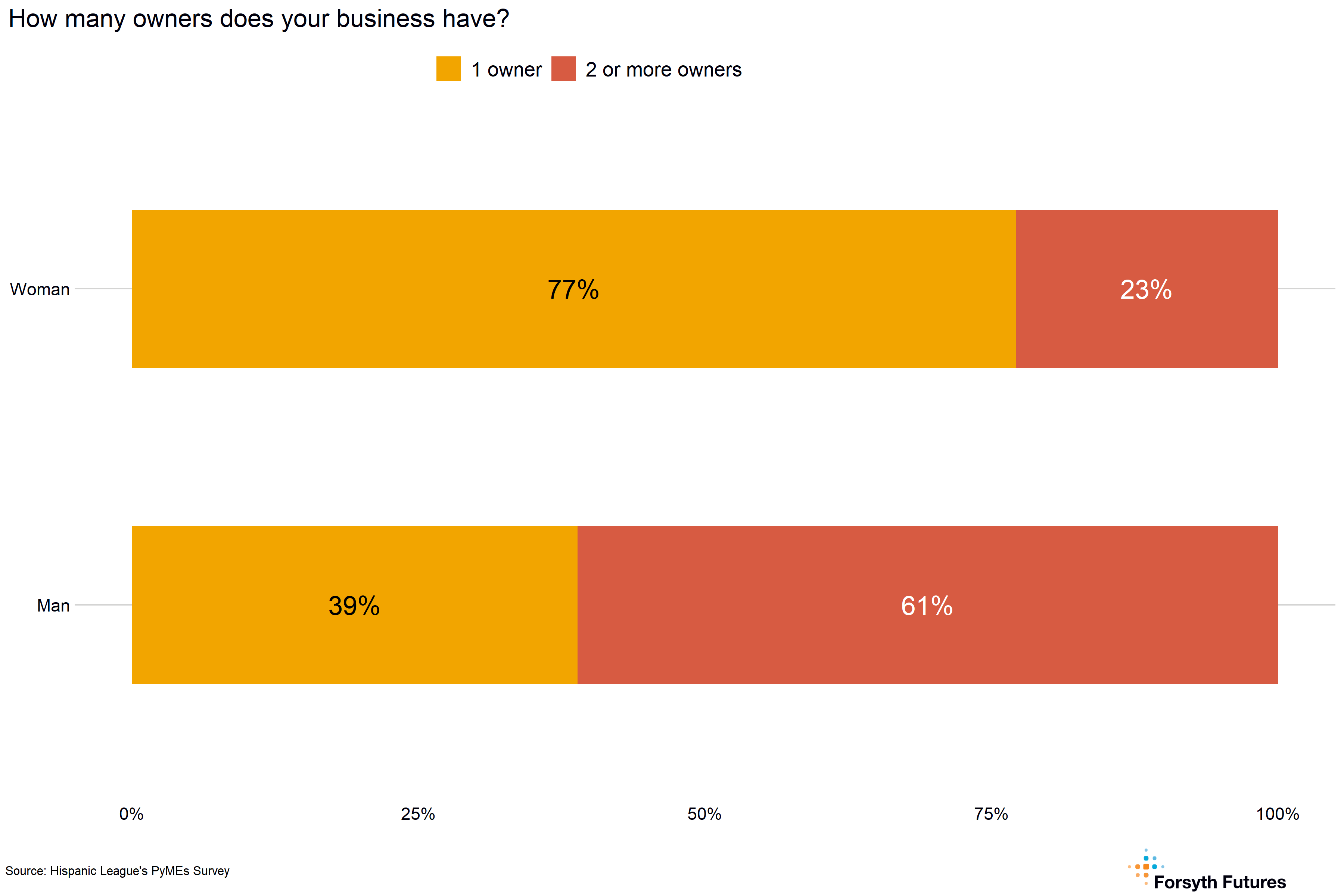 - 58% of current business owners report being their only business owners. Women are more likely to be sole owners than men; 77% of women said they were the only owner compared to 39% of men.