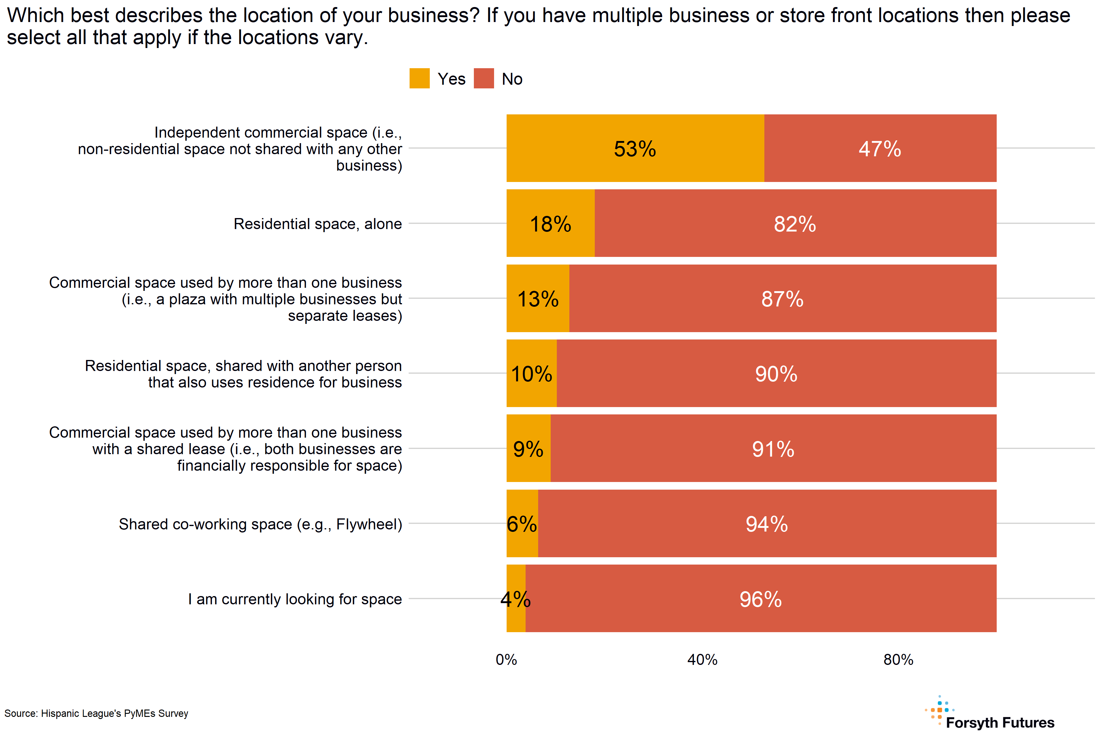 Most current owners indicated that their business location was in an independent commercial space (53%). Still, many respondents answered they had their business in a residential area where no other businesses were operating (18%).