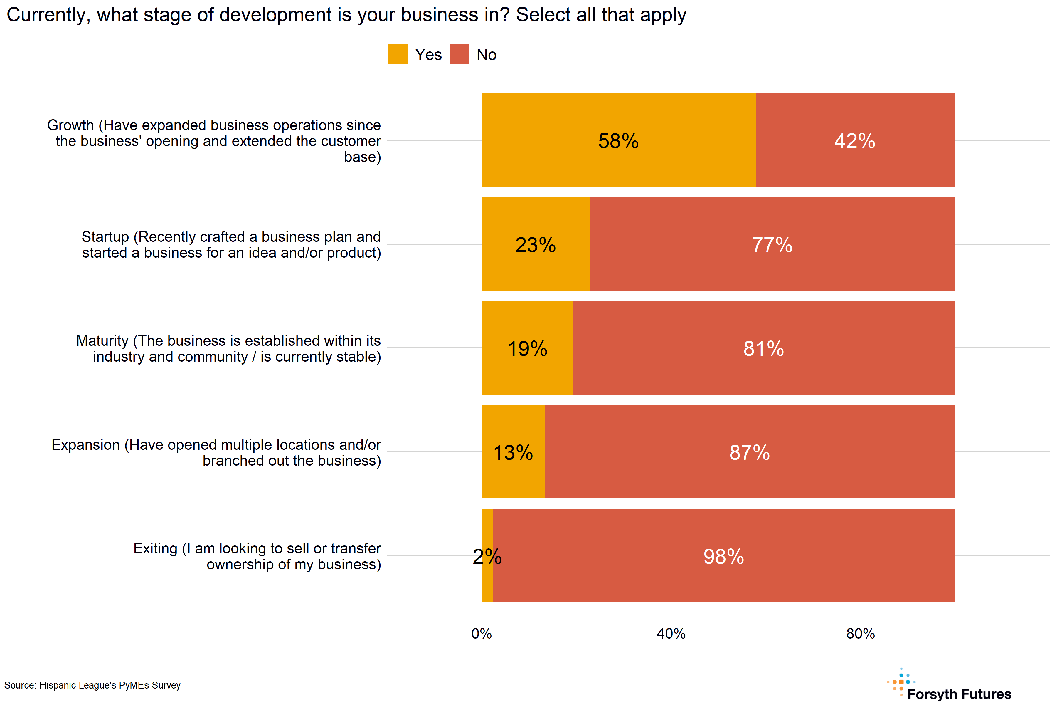 - 58% of current owners describe their business as being in the growth stage, and 23% describe their business as being in the startup stage.