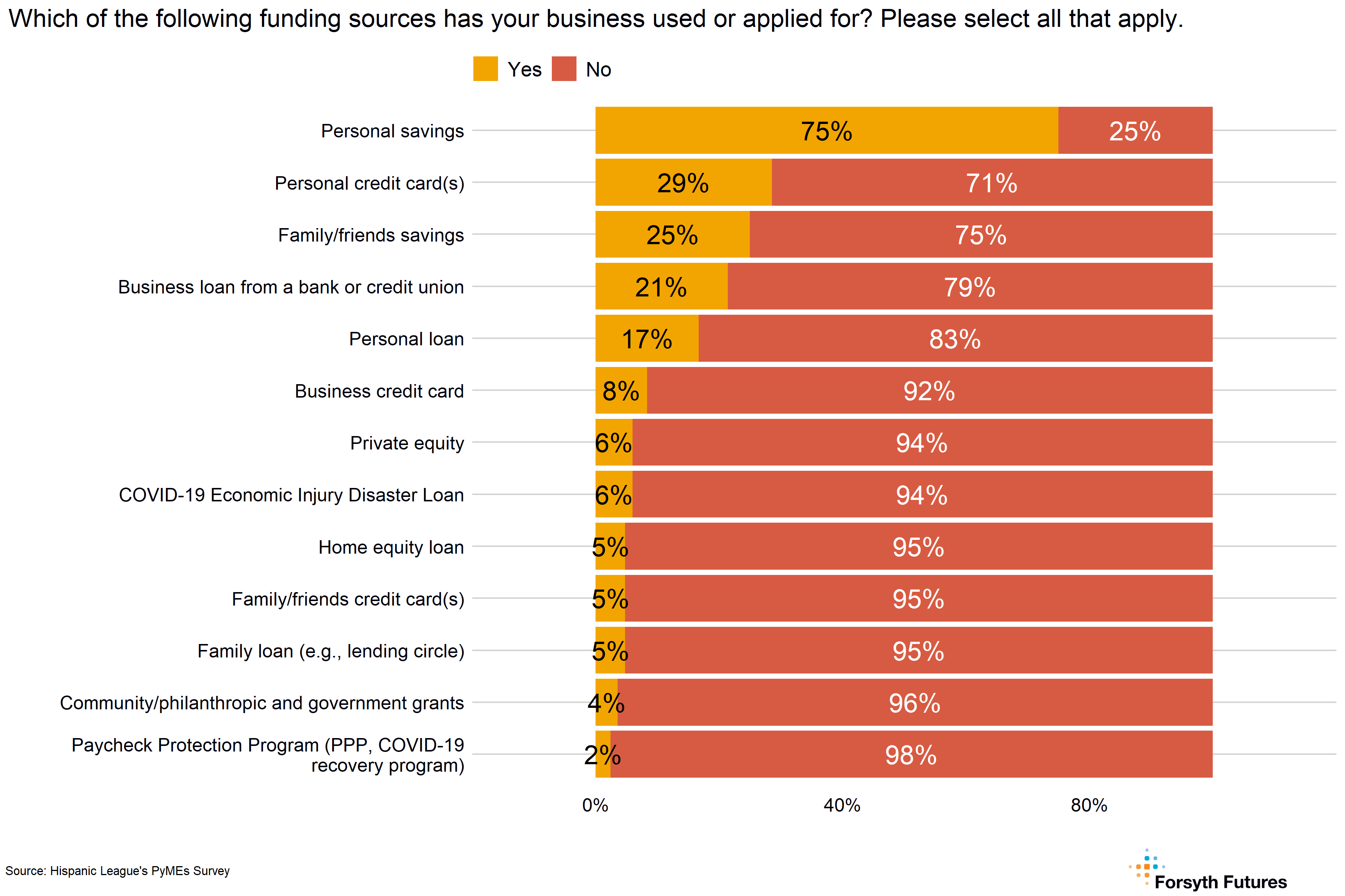 - 75% of current owners use personal savings as a funding source for their business. Other common funding sources include personal credit cards (29%), family / friend’s savings (25%), and a business loan from a bank or credit union (21%).
