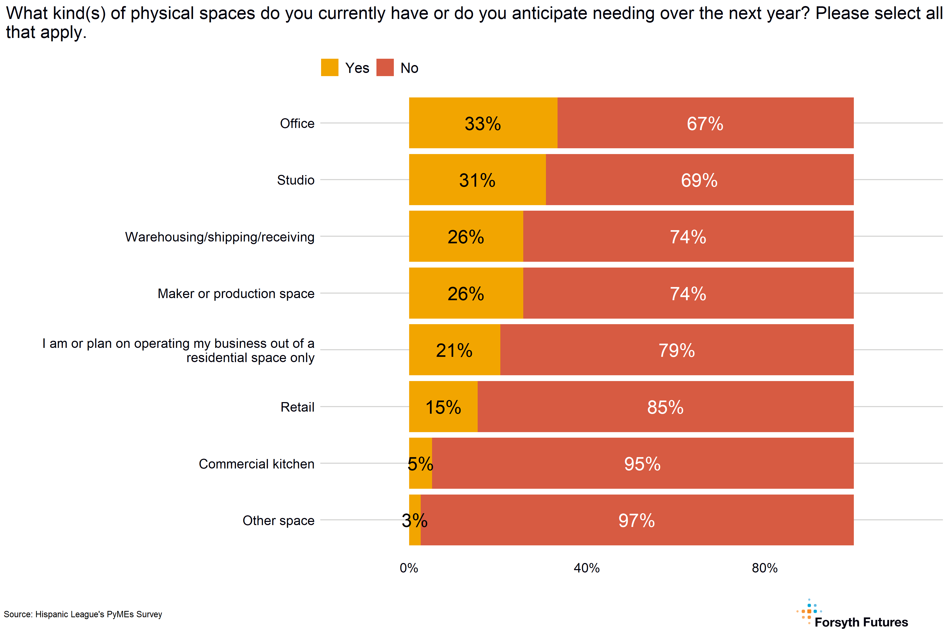 - The most common kinds of physical spaces prospective business owners anticipate needing over the next year are office (33%), studio (31%), maker or production space (26%), and warehousing/shipping/receiving space (26%).