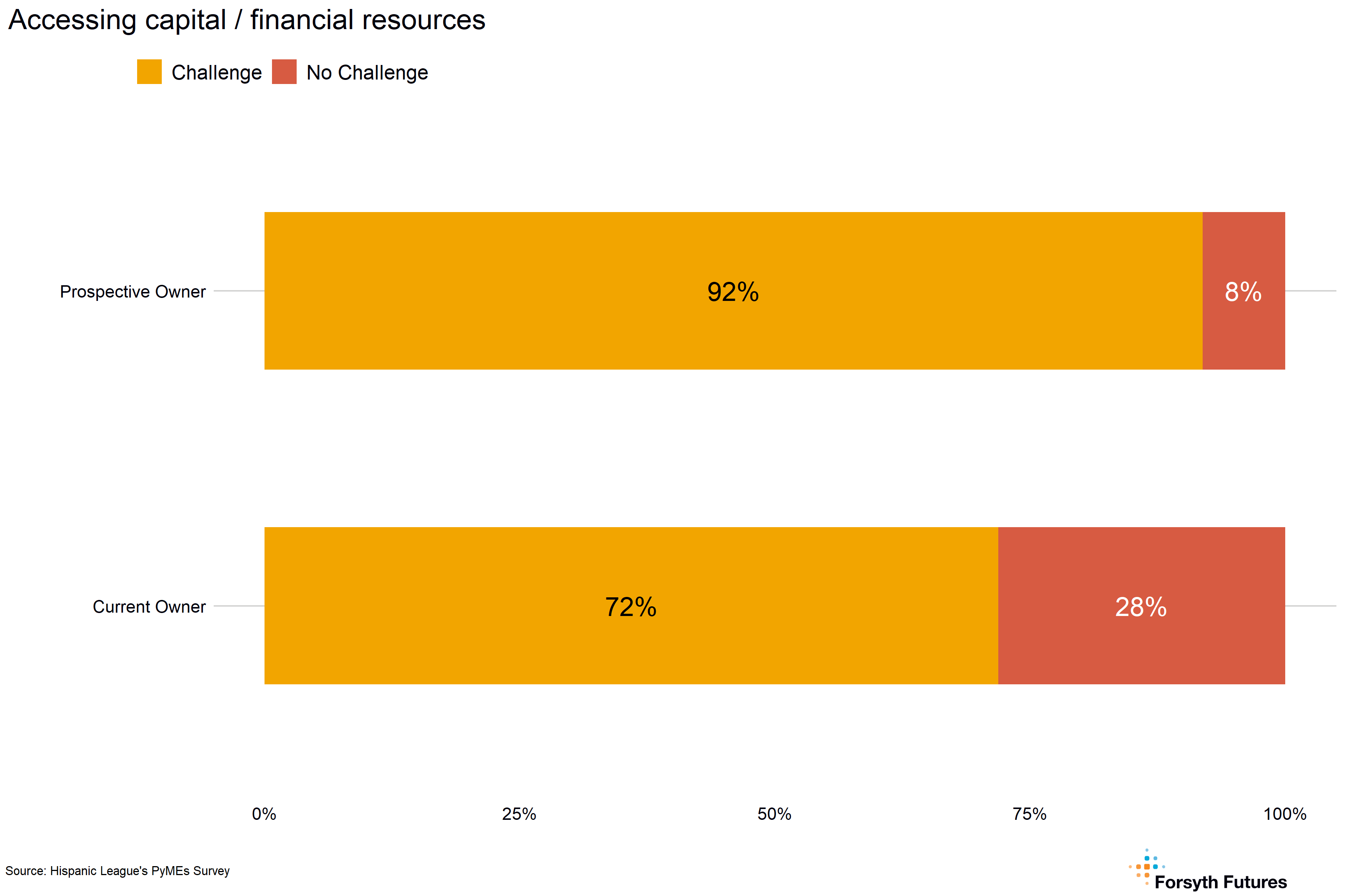 A significant relationship exists between being a prospective or current owner and whether or not accessing capital and financial resources is reported as a challenge. About 92% of prospective owners reported a challenge accessing capital / financial resources, compared to 72% of current owners.