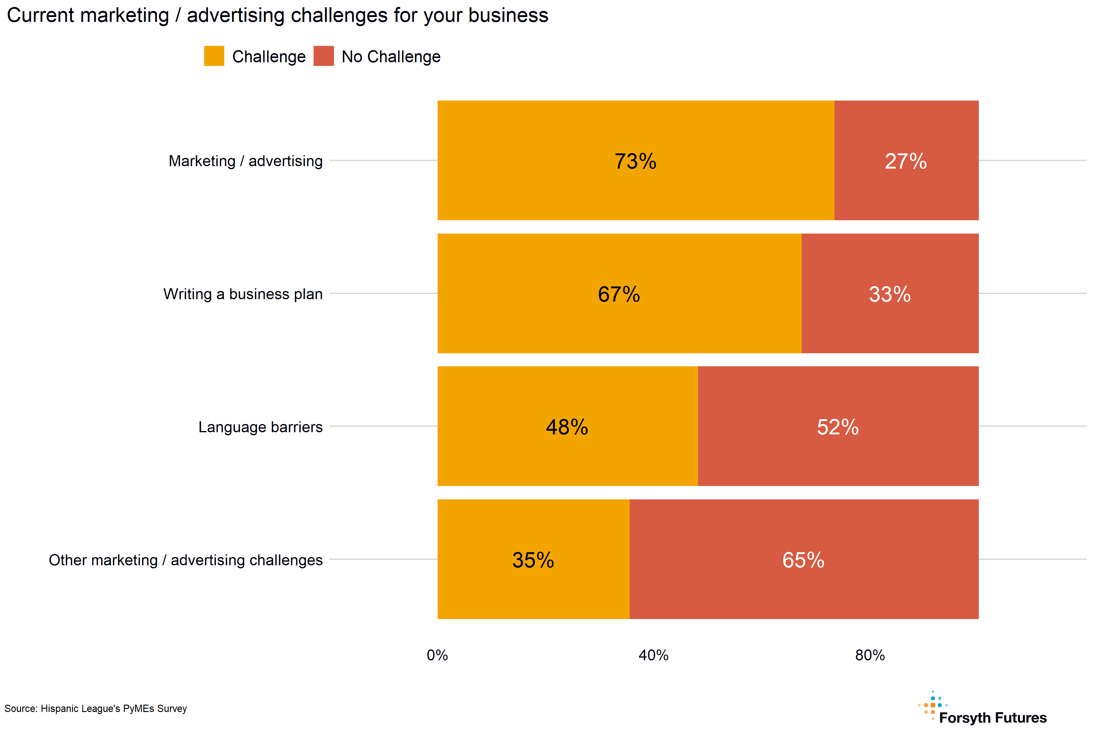 Most current and prospective owners had marketing / advertising business challenges, with marketing / advertising (73%) and writing a business plan (67%) having the highest percentage.