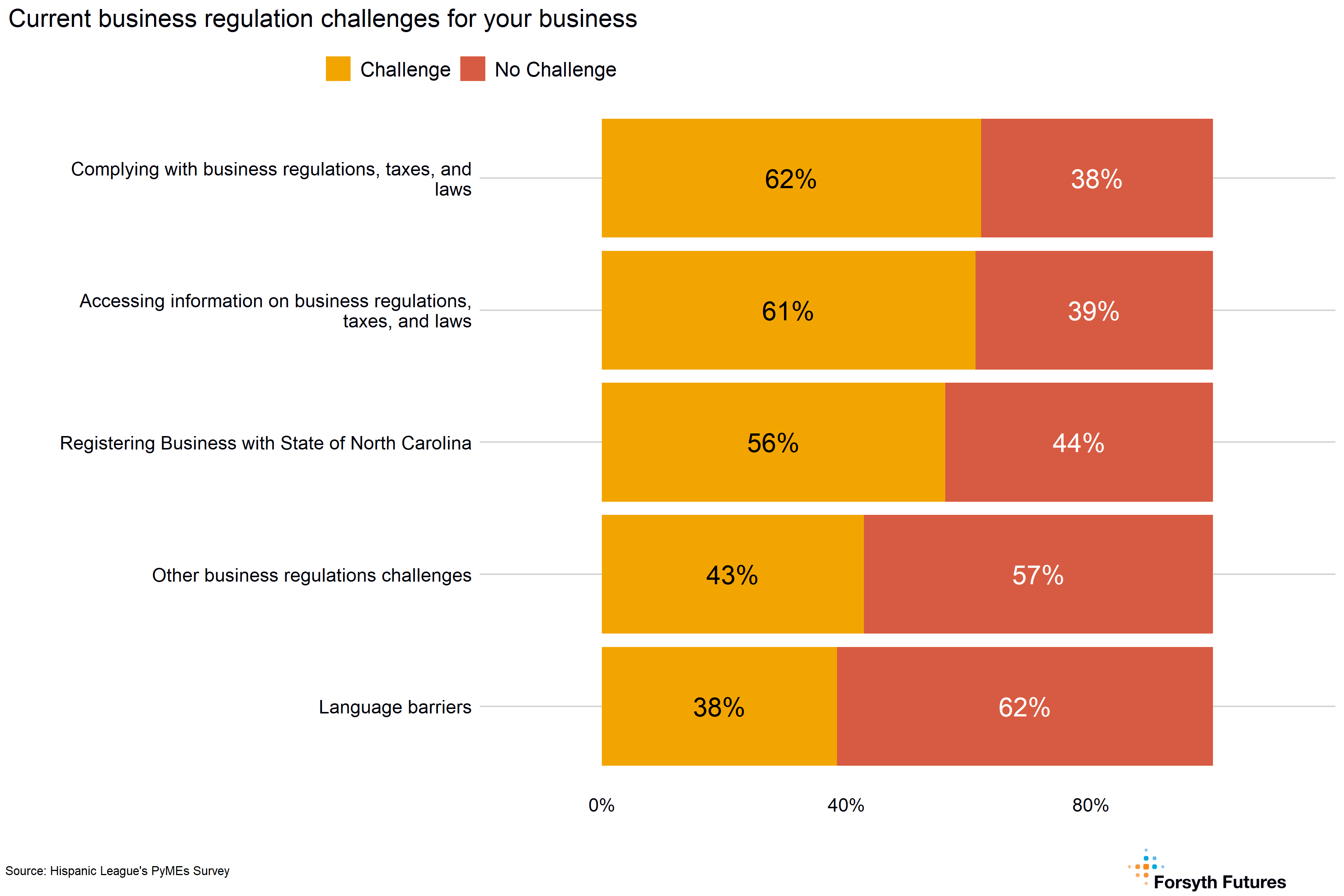 - More than half of current and prospective owners describe complying with business regulations, taxes, and laws (62%), accessing the information on business regulations, taxes, and laws (61%), and registering a business with the State of North Carolina (56%) as challenges. More prospective business owners (69%) describe registering a business with the State of North Carolina as a challenge, and the stage of business development is related to whether or not complying with business regulations, taxes, and laws is a challenge.