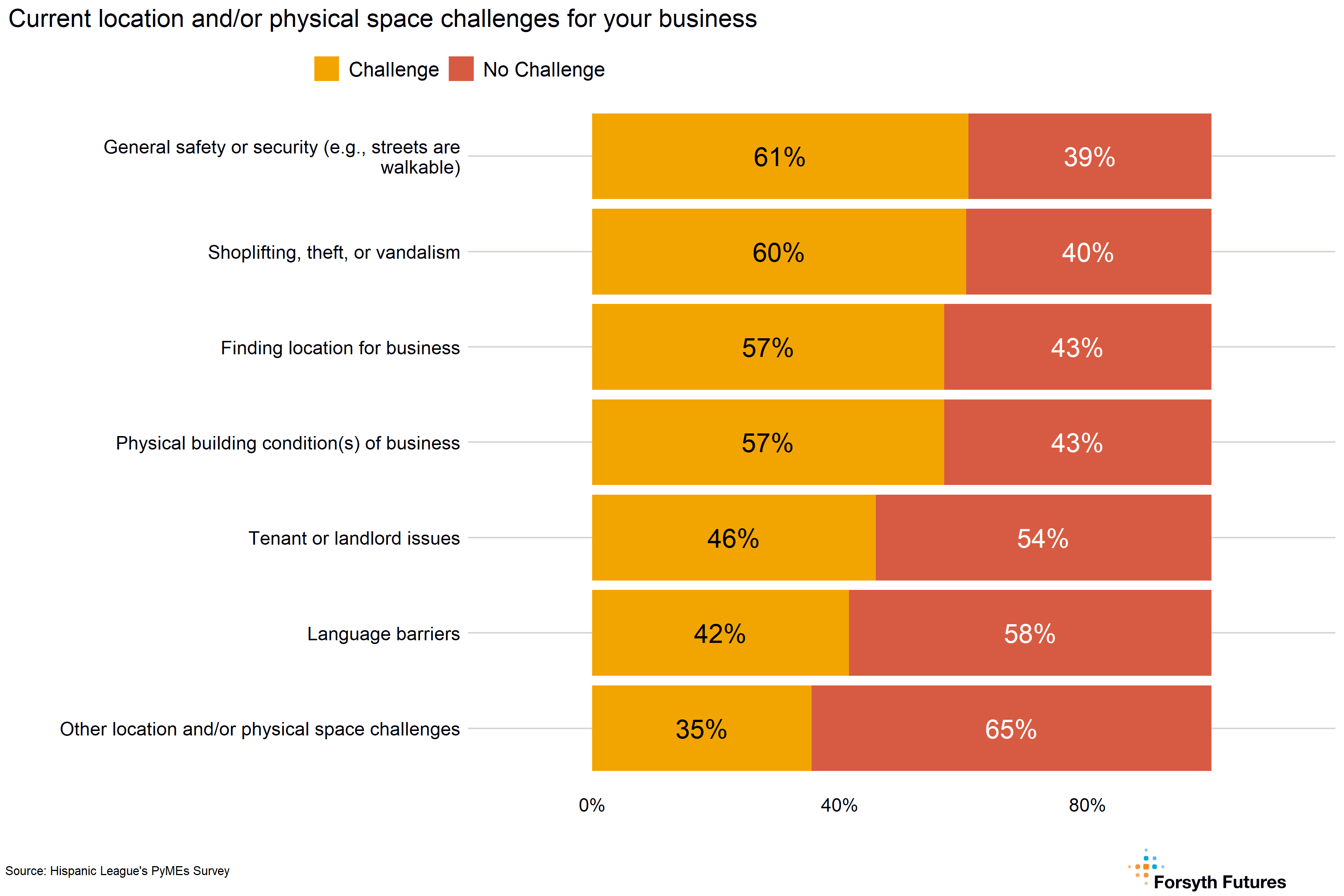 - More than half of current and prospective owners describe general safety or security (61%); shoplifting, theft, or vandalism (60%); finding a location for their business (57%); and physical building condition(s) of their business (57%) as a challenge. Prospective owners (71%) and current owners (49%) have challenges finding a location for their business, and men (58%) are almost twice as likely as women (31%) to report challenges with the tenant or landlord issues.