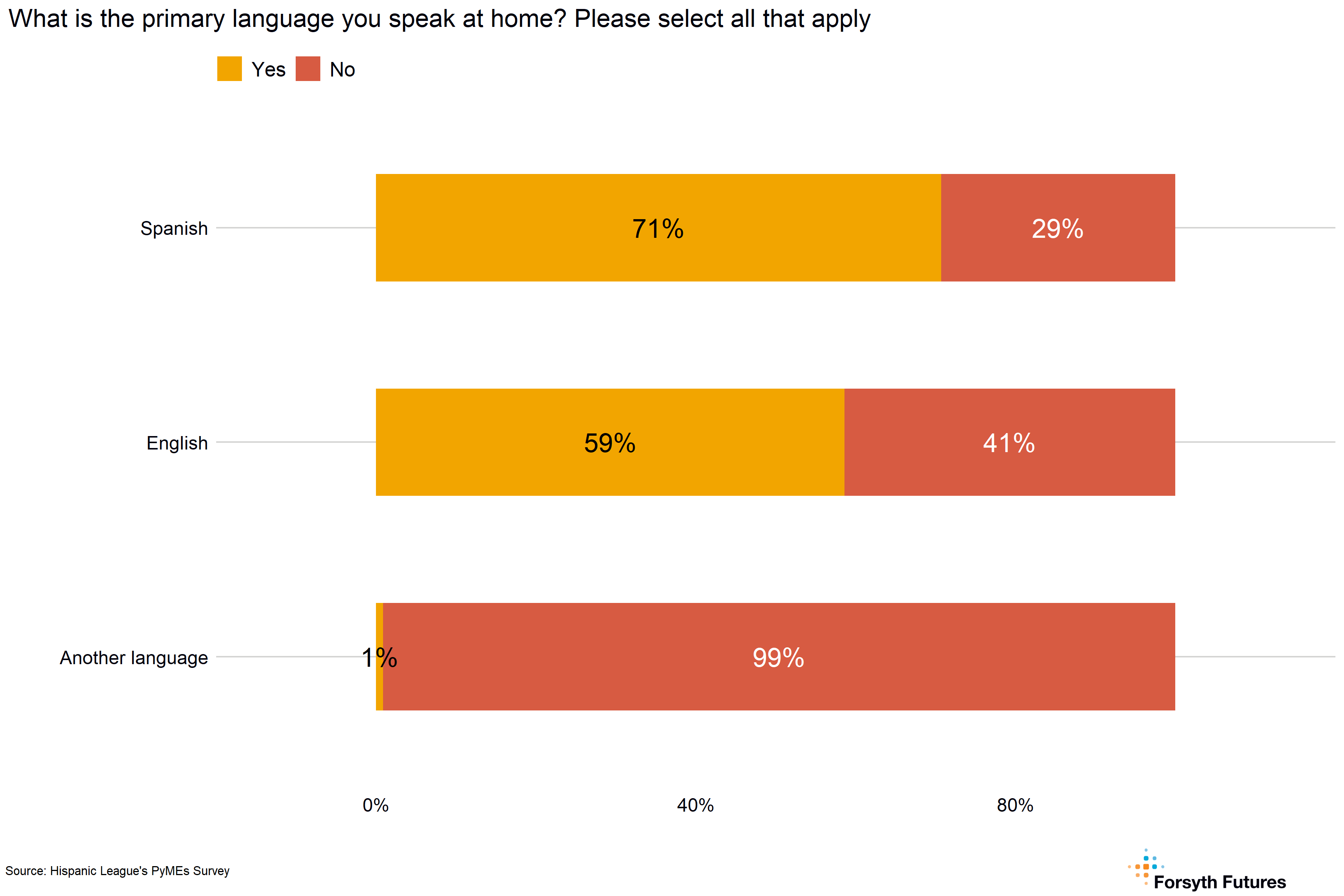 Approximately 71% of respondents speak Spanish at home, and 59% speak English; this includes respondents who speak more than one language at home. One respondent reported speaking French in addition to English and Spanish at home.