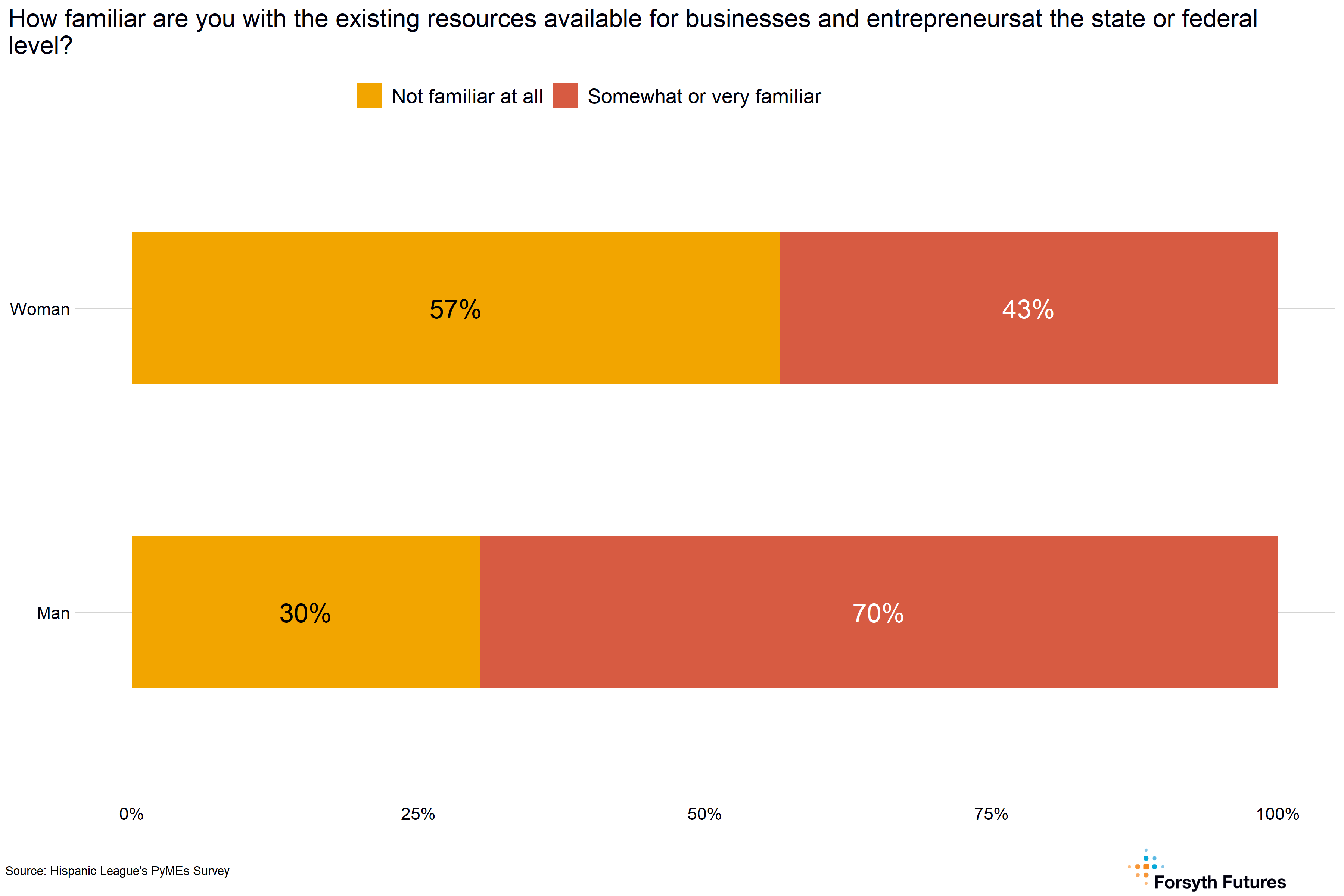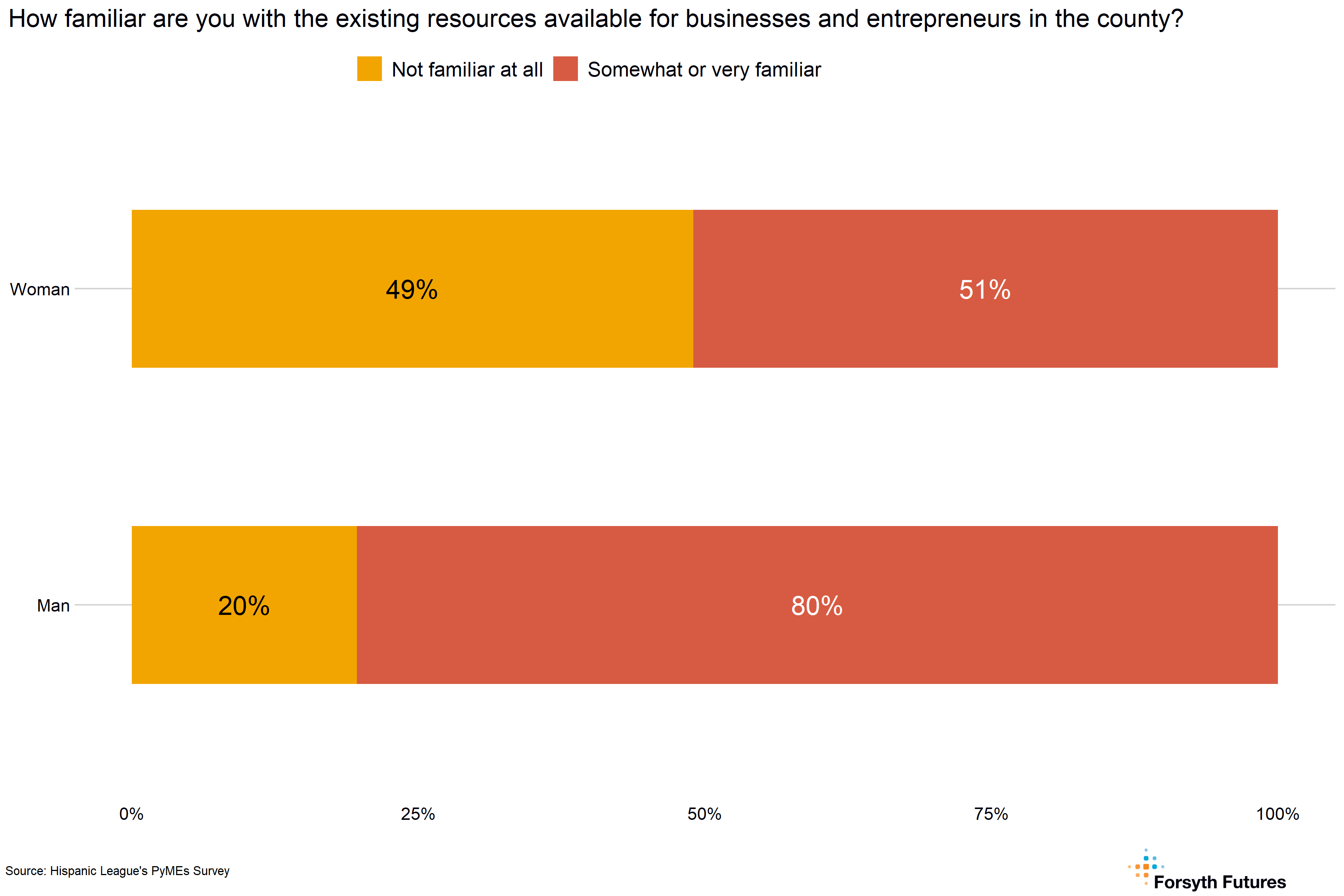 - Overall, 23% of current and prospective owners are familiar with existing resources for businesses and entrepreneurs in the county, 44% are somewhat familiar, and 33% are not familiar at all. Women were less likely to be familiar than men, as 49% of women reported they were not familiar at all with county resources compared to 20% of men.