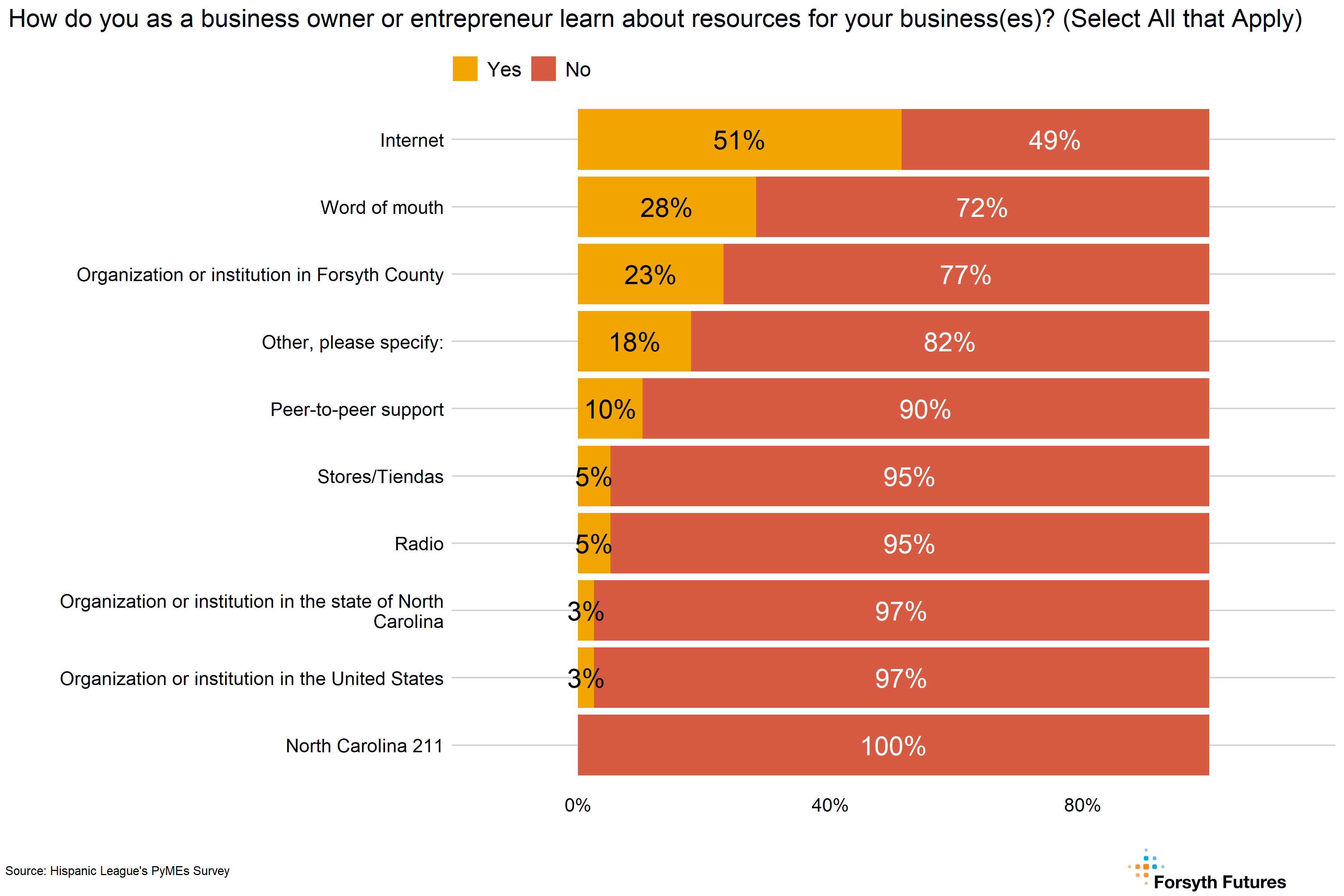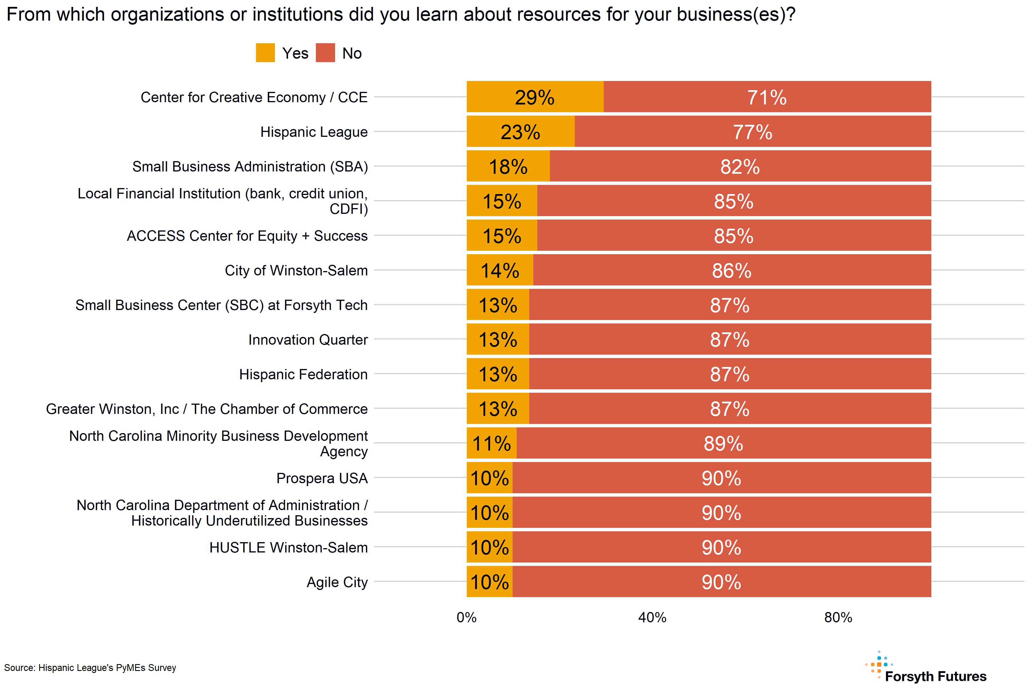 - The most common ways current and prospective owners hear about resources are the internet (51%), word of mouth (28%), and an organization or institution in Forsyth County (23%). The most common organizations / institutions current and prospective owners learn about resources are the Center for Creative Economy (29%), the Hispanic League (23%), and the Small Business Administration (18%).