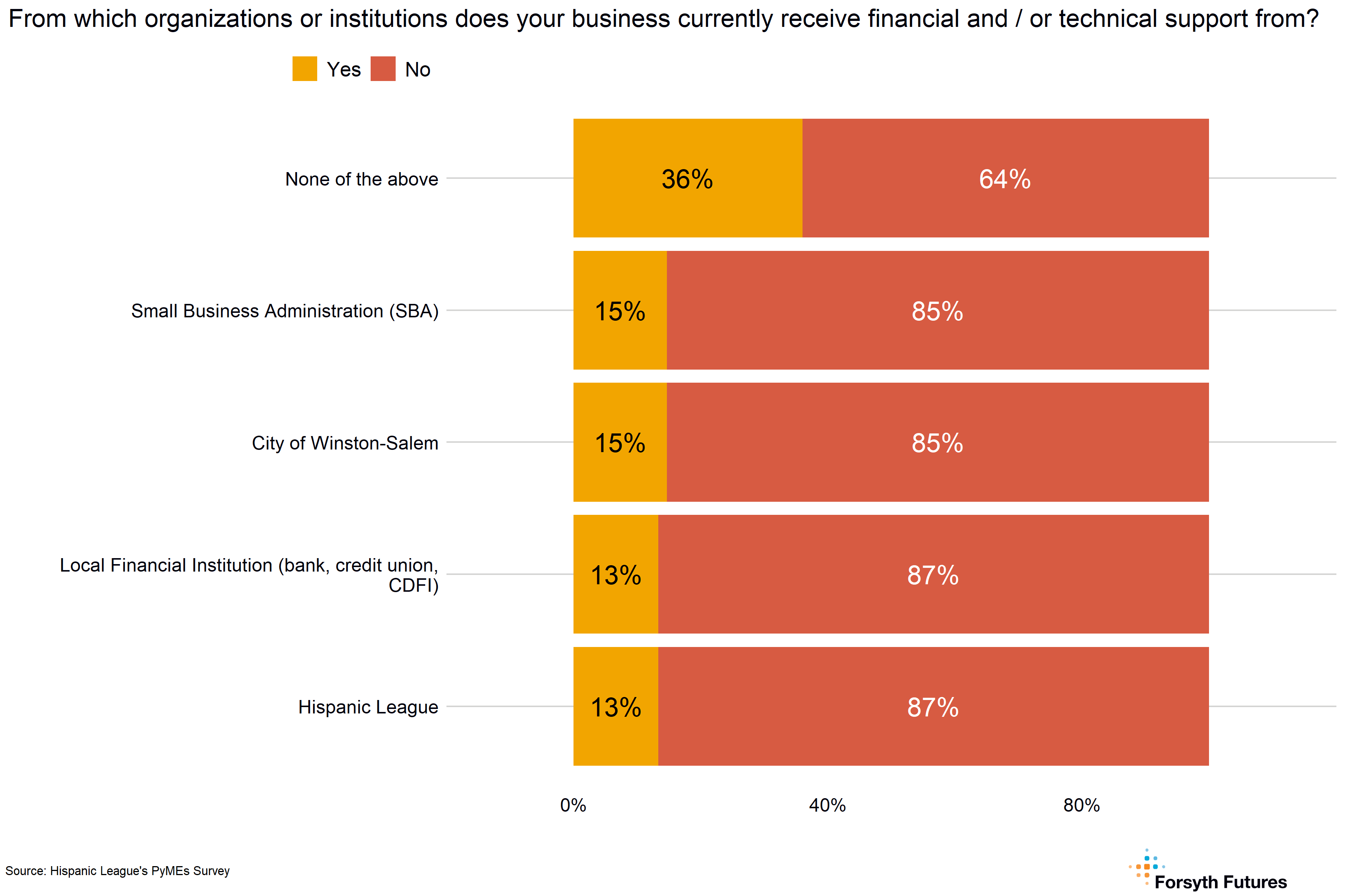 A minority of respondents indicated that their business currently receives financial aid or technical support from the Small Business Administration (15%), City of Winston-Salem (15%), a local financial institution (13%), and the Hispanic League (13%). A little over one-third of owners or entrepreneurs (36%) reported that none of the groups listed provided their business with any financial or technical report.